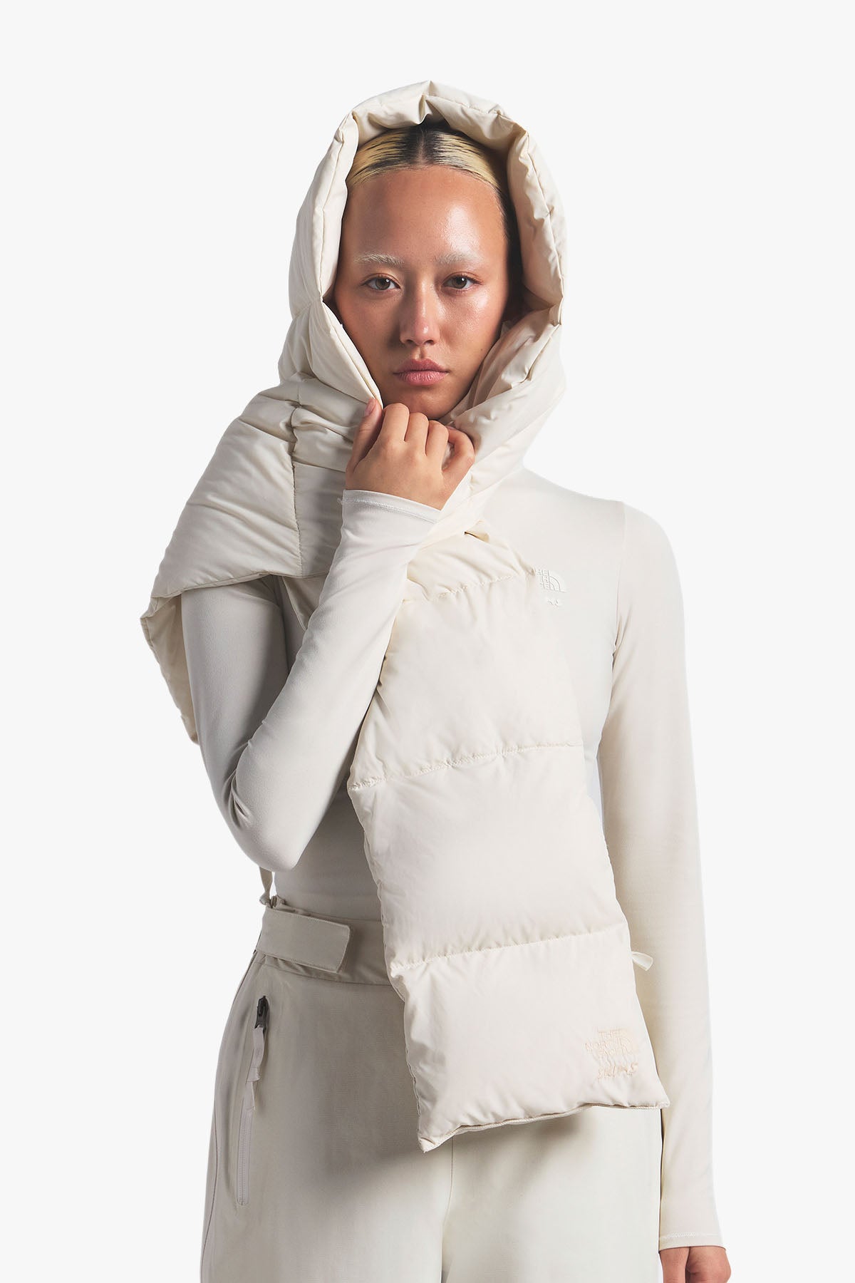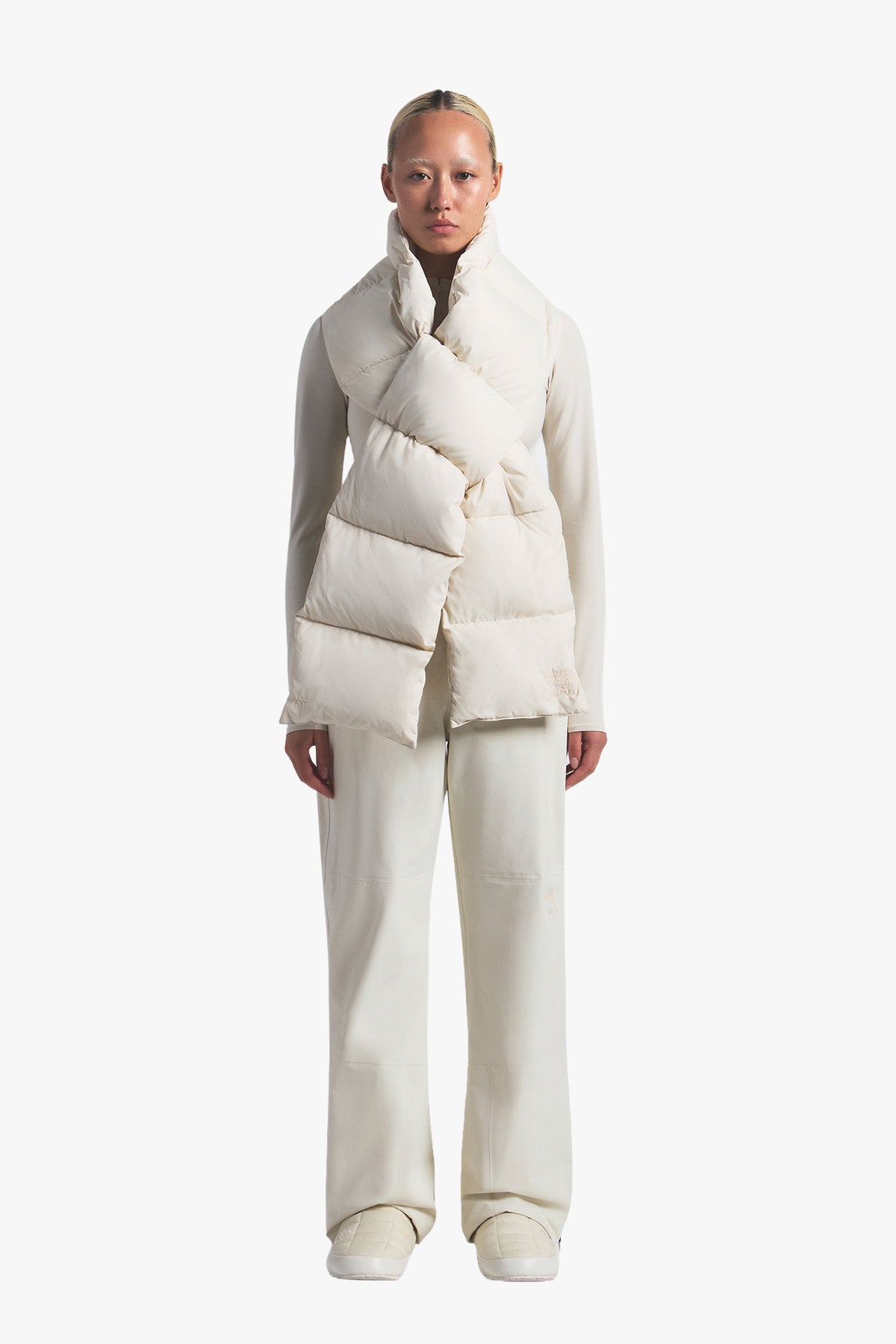 A winter essential inspired by the iconic Nuptse design. This down filled scarf brings the warmth of 700 fill insulation to a sleek and versatile silhouette. Crafted with a pass through slot for a secure fit around the neck, it also packs neatly into its own co branded stow pocket for effortless storage. Finished with embroidered logo details. Part of the limited edition The North Face x Skims Collection.