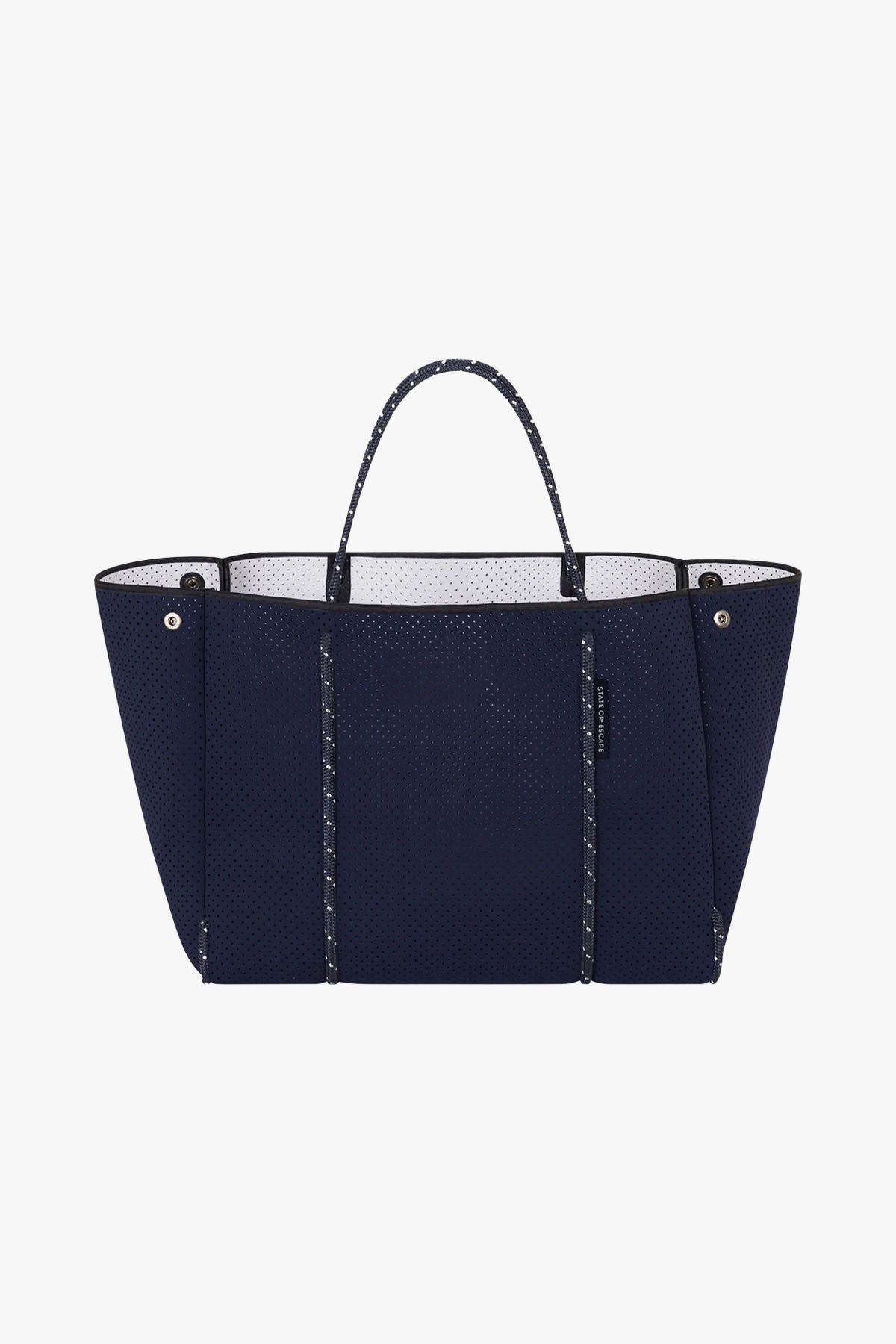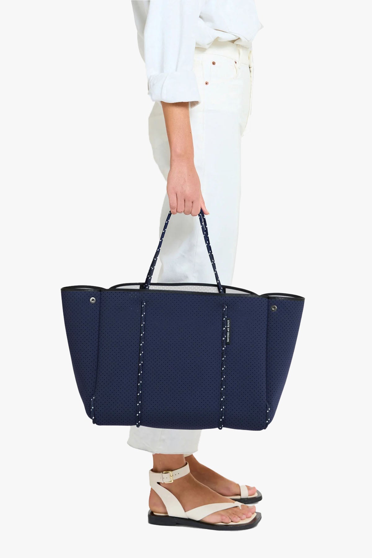 The original Escape™ Tote is a refined mid-size essential designed for life on the go. Made from lightweight perforated neoprene with contrast sailing rope handles, it offers both durability and comfort. Complete with a removable zip pouch, press studs for adjustable width, and a mesh dust bag, it's the ideal blend of function and minimalist style.