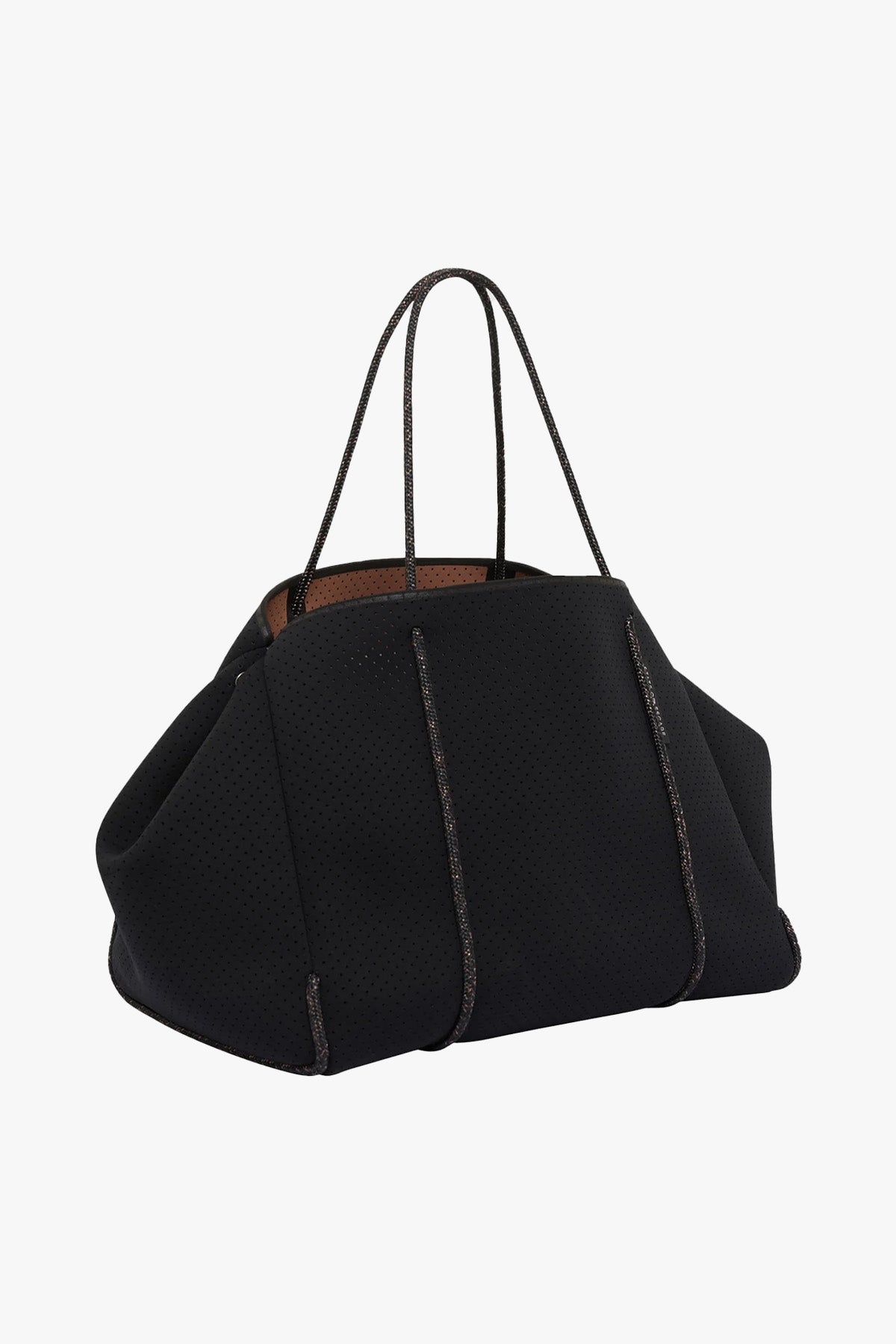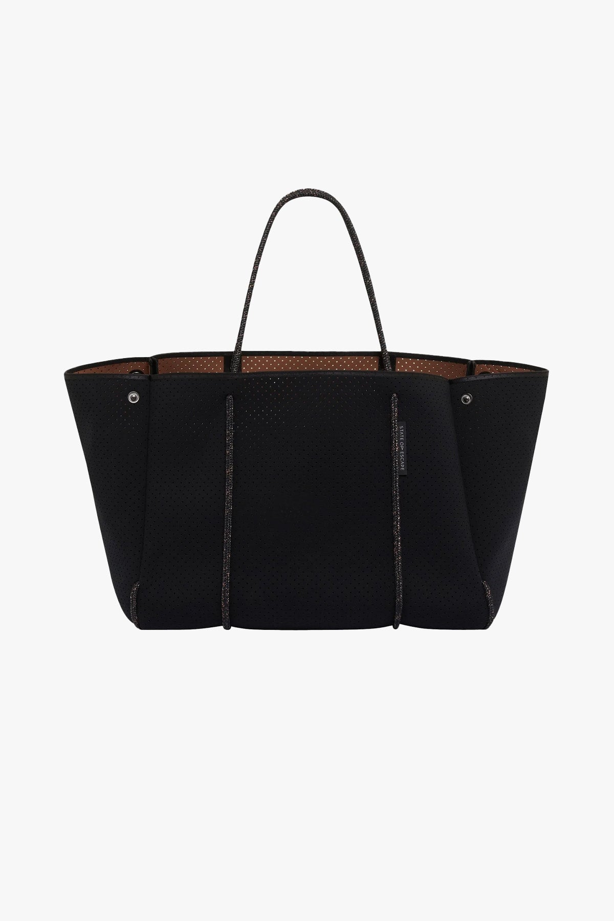 The original Escape Tote—reimagined in classic black with warm saddle-toned accents. This beloved mid-size tote blends minimalist design with maximum functionality. Crafted from lightweight perforated neoprene and finished with signature sailing rope handles, it's ready for everyday journeys and spontaneous getaways. Designed with a spacious interior, a removable valuables pouch, and adjustable press stud sides to transform the silhouette in an instant.