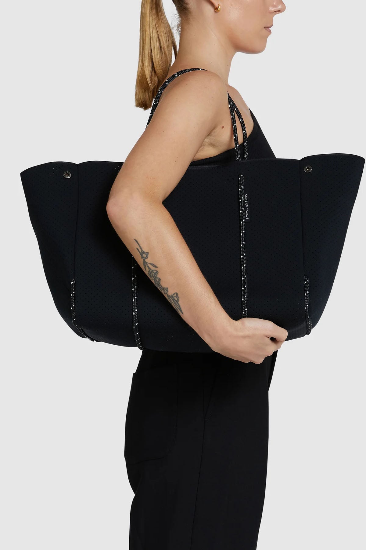 Confidently simple and distinct. Lightweight for mind and body. The State Of Escape tote is the original carryall neoprene tote bag. With a nifty hidden internal pouch to keep valuables safe. Escape to your happy place, within or far away.